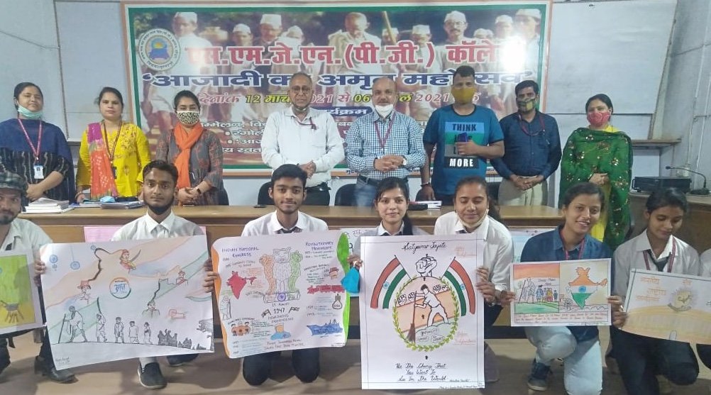 हरिद्वार। एस.एम.जे.एन पीजी काॅलेज में आज ‘आजादी का अमृत महोत्सव’ पखवाड़े के अन्तर्गत छात्र-छात्राओं द्वारा पोस्टर प्रतियोगिता का आयोजन किया गया। पोस्टर प्रतियोगिता कु. लवली पाण्डेय ने दांडी मार्च, खुशबू शर्मा ने चिपको आन्दोलन, कु. नेहा ने भारत का संविधान, गौरव बंसल ने आजादी का अमृत महोत्सव, गणेश गौड़ ने आजादी की यात्रा, गुंजन पाण्डेय व नवनीत कौर ने बिफोर व आफ्टर इंडीपेंण्डेंस तथा आमिर ने चूल्हे से चांद तक पहुंची महिला आदि शीर्षकों व विचारों को पोस्टर के रूप में प्रस्तुत किया।