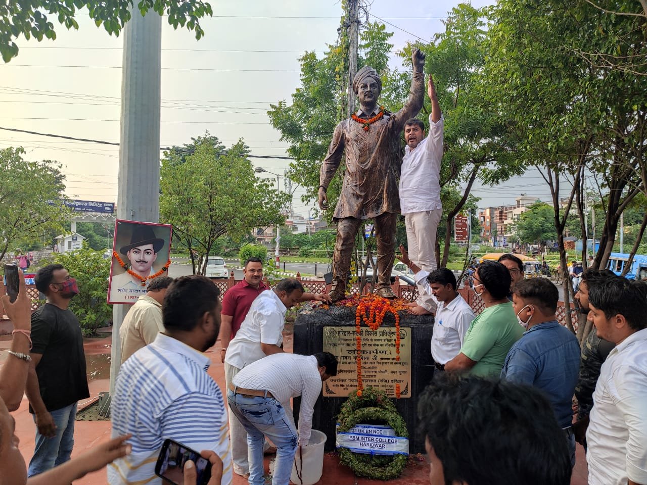 स्वतंत्रता दिवस की पूर्व संध्या पर हरिद्वार ग्रामीण के कार्यकारी जिलाध्यक्ष राजीव चौधरी, रोहित चौधरी, मेयर प्रतिनिधि अशोक शर्मा, युवा कांग्रेस जिलाध्यक्ष रवि बहादुर के नेतृत्व में कांग्रेस के नेताओं ने शहीद सरदार भगत सिंह, शहीद उधम सिंह, शहीद महात्मा गांधी की मूर्तियों की सफाई कर गंगाजल व दूध से सभी मूर्तियों का स्नान कराकर माल्यार्पण किया। इस अवसर पर कार्यकर्ताओं को संबोधित करते हुए राजीव चौधरी ने कहा कि इन शहीदों के बलिदान से ही आज हम लोग भारत के अंदर आजादी की हवा में सांस ले रहे हैं। शहीद ऊधमसिंह और भगतसिंह जैसे नौजवानों ने युवावस्था में ही देश के लिए देश की आजादी के लिए अपने प्राणों का बलिदान कर दिया। इस अवसर पर हम लोग सभी कांग्रेस के साथ ही यह संकल्प लेते हैं कि इन शहीदों की विचारधारा पर चलते हुए देश को आगे बढ़ाने के लिए भ्रष्टाचार मुक्त भारत के लिए गरीबों के लिए संघर्ष बेरोजगारों के लिए संघर्ष का संकल्प लेते हैं।