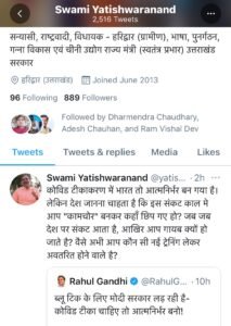 स्वामी यतीश्वरानंद पर निशाना साधते हुए लिखा है कि – कोविड टीकाकरण में भारत तो आत्मनिर्भर बन गया है। लेकिन देश जानना चाहता है कि इस संकट काल मे आप “कामचोर” बनकर कहाँ छिप गए हो? जब जब देश पर संकट आता है, आखिर आप गायब क्यों हो जाते है? वैसे अभी आप कौन सी नई ट्रेनिंग लेकर अवतरित होने वाले है?