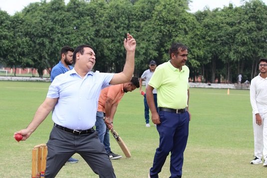 डीपीएस रानीपुर के प्रधानाचार्य डॉ अनुपम जग्गा बॉलिंग करते हुए