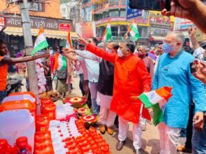 हरिद्वार। हर की पौड़ी पर राज्यसभा सांसद नरेश बंसल के द्वारा अमृत महोत्सव पर्व का जो आह्वान यशस्वी प्रधानमंत्री नरेंद्र मोदी द्वारा किया गया था। उसके कार्यक्रमों की श्रंखला का शुभारंभ किया गया। उन कार्यक्रमों को सभी सांसद सदस्य सभी विधानसभा सदस्यों विधायकों व जनप्रतिनिधियों द्वारा अपने-अपने क्षेत्र में करने का आह्वान प्रधानमंत्री नरेंद्र मोदी ने किया है। उस कार्यक्रम की शुरुआत में आजादी की 75 वीं वर्षगांठ के अवसर पर अमृत महोत्सव मनाने का जो निर्णय केंद्र की मोदी सरकार द्वारा लिया गया, उसके संबंध में जानकारी देते हुए कार्यक्रम के मुख्य अतिथि राज्य सभा सांसद नरेश बंसल ने कहा कि हमारे देश के युवाओं ने बुजुर्गों ने बच्चों ने महिलाओं ने आजादी प्राप्त करने के लिए अपनी जान की बाजी लगाई थी। आज जब हम आजादी के 75 वर्ष में प्रवेश कर रहे हैं जो भारत एक विश्व शक्ति के रूप में उभर कर सामने आ रहा है। भारत की संघर्षपूर्ण इतिहास की पहचान है। जिसके द्वारा हम लोग संस्कारित हुए हैं और हमने यह संस्कार प्राप्त किए हैं। किसी भी विषम परिस्थिति में न हारेंगे, न थकेंगे, न रुकेंगे और इसी मंत्र के साथ आज देश के नोजवान डॉक्टर चिकित्सक और समाज का हर वर्ग को रोना की महामारी से लड़ने में प्रधानमंत्री नरेंद्र मोदी के साथ हाथ से हाथ मिला कर खड़ा हुआ है। जिसके बल पर हम लोगों ने इतने कम समय में कोरोना की दूसरी लहर से भी विजय पा ली है। उन्होंने आह्वान किया कि हरिद्वार के हर की पौड़ी जो कि आध्यात्मिक स्थल है विश्व का उस स्थान से आज हम लोग सामूहिक राष्ट्रगान कर तिरंगा ध्वज वितरण का काम शुरू कर रहे हैं जिसके द्वारा प्रत्येक व्यक्ति के अंदर राष्ट्र के प्रति संचार सेवा का संकल्प लें उड़ता बनाए रखने के लिए एकजुट होकर राष्ट्र विरोधी ताकतों का मुकाबला कर सके।