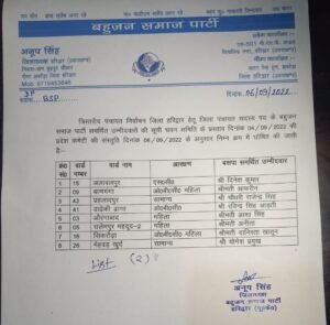 हरिद्वार। बहुजन समाज पार्टी ने दूसरी सूची जारी कर दी है। जिसमें प्रहलादपुर सीट से चौधरी राजेंद्र सिंह को प्रत्याशी बनाया है। सूची जिलाध्यक्ष अनूप सिंह ने जारी कर दी है। अभी 9 प्रत्याशियों की सूची जारी नहीं की जा सकी है। सूची में सलेमपुर 2 से अनीता को प्रत्याशी बनाया है। बाणगणा से आफरीन को, मेहवड खुर्द से योगेश प्रमुख को, ढाढेकी ढाणा से रविंद्र सिंह आढ़ती पर विश्वास जताया है।