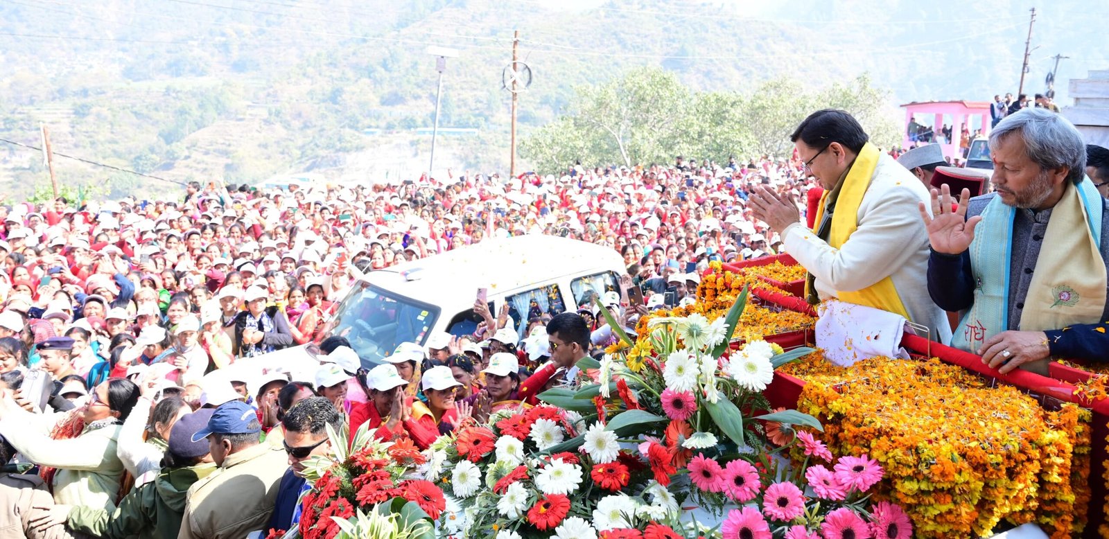 चमोली। मुख्यमंत्री पुष्कर सिंह धामी ने जनपद चमोली के गौचर में “नंदा-गौरा महोत्सव” के अंतर्गत आयोजित रोड शो में प्रतिभाग किया। इस दौरान हजारों की संख्या में पहुंचे युवाओं, मातृशक्ति, बुजुर्गों एवं बच्चों ने पुष्प वर्षा कर मुख्यमंत्री का स्वागत किया। मुख्यमंत्री ने कहा कि यह अथाह जनसमूह डबल इंजन सरकार द्वारा उत्तराखण्ड में संचालित विभिन्न योजनाओं पर देवतुल्य के जनता अपार विश्वास को परिलक्षित करता है।