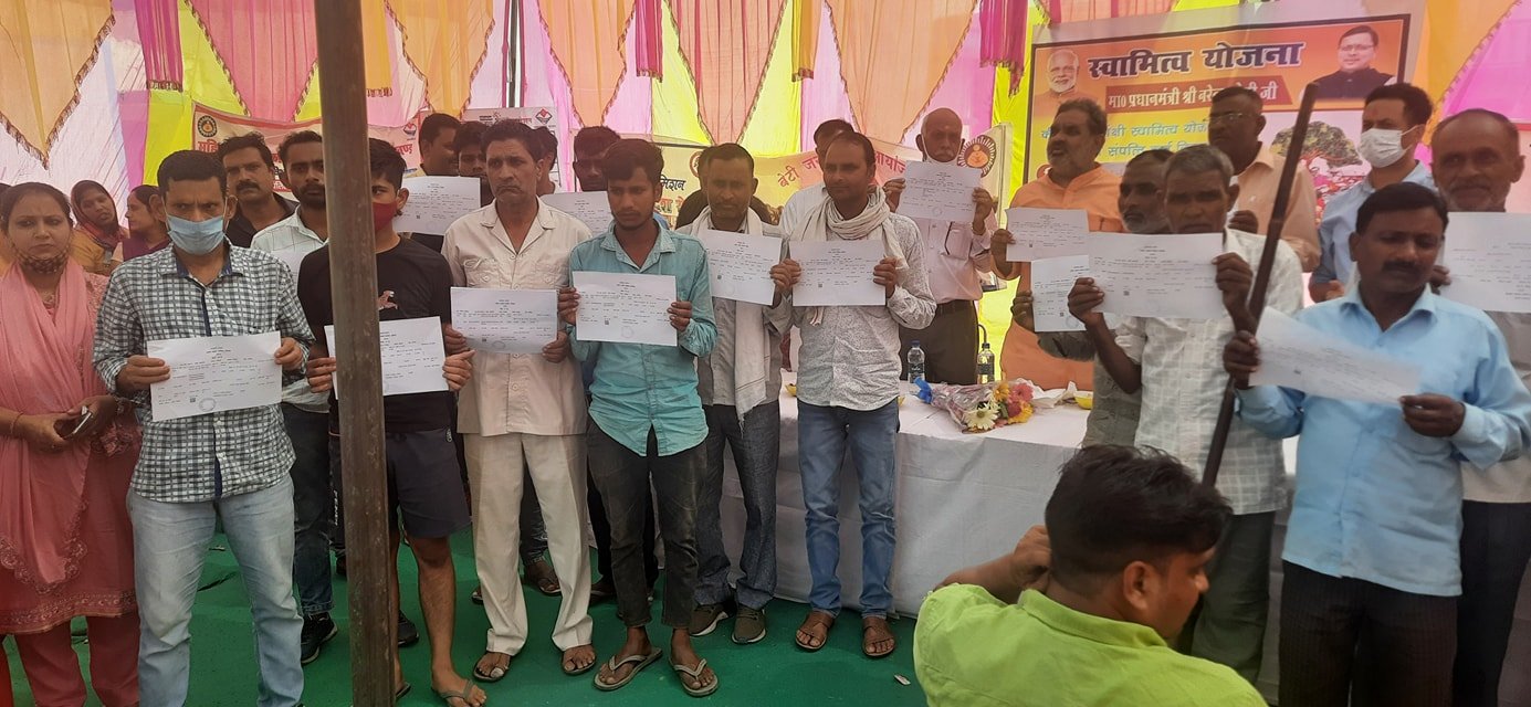 स्वामित्व योजना के तहत घर की भूमि का मालिकाना हक का प्रमाण देते हुए कैबिनेट मंत्री स्वामी यतीश्वरानंद
