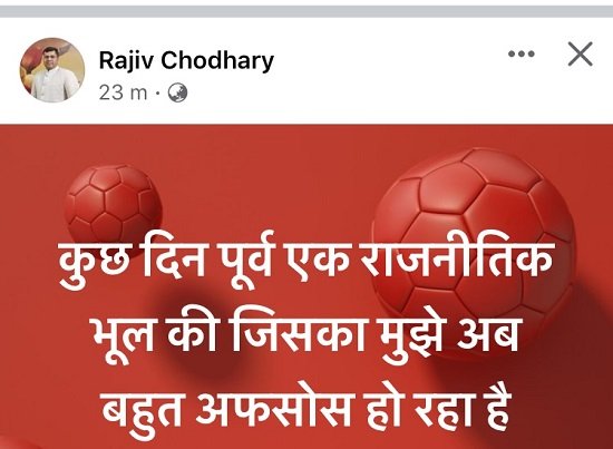 इन्हीं नेताओं में एक नाम राजीव चौधरी का भी था, जोकि रात दिन झगड़ों में शामिल रहा और जान जोखिम में डालकर चुनाव मैदान में उतरा, उसने दरकिनार किए जाने पर अपना दुख फेसबुक पर ब्यां किया है। उन्होंने लिखा है कि कुछ दिन पूर्व एक राजनीतिक भूल की जिसका मुझे अब बहुत अफसोस हो रहा है, ये लाइन लिखते ही समर्थकों ने अपनी पीड़ा और कटाक्ष ​करने शुरू कर दिए। एक ने लिखा कि अजमाई को आजमाना बेवकूफ कहलाना, इसका मतलब कई लोग तरह—तरह से निकाल रहे हैं।