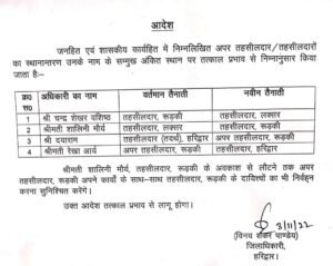 हरिद्वार। हरिद्वार जनपद में 3 तहसीलों के तहसीलदार बदल दिए हैं। हरिद्वार की जिम्मेदारी रेखा आर्य को मिली है, जबकि लक्सर की जिम्मेदारी चंद्रशेखर वशिष्ठ को मिली है, रुड़की की जिम्मेदारी शालिनी मौर्य को मिली है. हरिद्वार तहसीलदार दयाराम को रुड़की में अपर तहसीलदार बनाकर भेज दिया है