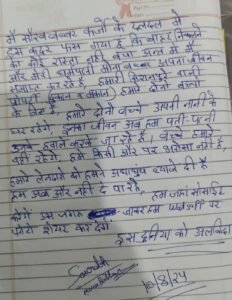 मैं सौरब बब्बर कर्जों के दलदल में इस कदर फंस गया हूं कि बाहर निकलने का कोई रास्ता नहीं बचा। अंत में मैं और मेरी धर्मपत्नी मोना बब्बर अपना जीवन समाप्त कर रहे हैं, हमारी किशनपुरे वाली प्रॉपर्टी दुकान व मकान हमारे दोनों बच्चों के लिए हैं। हमारे दोनों बच्चे अपनी नानी के घर रहेंगे, इनका जीवन अब हम पति—पत्नी उनके हवाले करके जा रहे हैं। बच्चे वहीं रहेंगे। हमें किसी और पर भरोसा नहीं है। हमारे लेनदारों केा हमने अधाधुंध ब्याजे दी हैं। हम अब और नहीं दे पा रहे। हम जहां सुसाइड करेंगे उस जगह जाकर हम व्हाट्सअप पर फोटो शेयर कर देंगे।