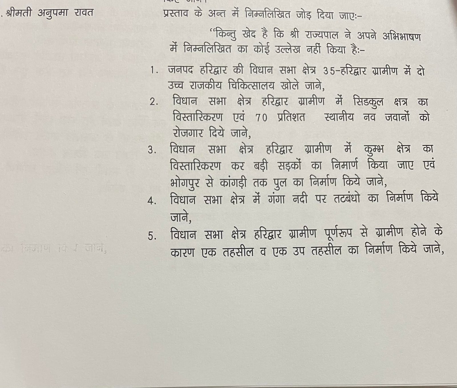 इसी के साथ विधायक अनुपमा रावत ने हरिद्वार ग्रामीण विधानसभा में तहसील के साथ एक उप तहसील बनवाने की भी मांग उठाई थी, तो उनका किया हुआ। यदि क्षेत्र में एक तहसील और एक उप तहसील बन जाए तो जनता को बड़ी सुविधा होगी। भाजपा के जिला पंचायत सदस्य प्रतिनिधि अरविंद कुमार ने आरोप लगाया है कि कांग्रेस की विधायक पूरी तरह से विफल साबित हुई है। भाजपा सरकार के मुख्यमंत्री पुष्कर सिंह धामी जनताहित में निरंतर काम कर रहे हैं। कांग्रेस की विधायक जिस सुकरासा नदी के पुल पर श्रेय ले रहीं हैं, उसका प्रस्ताव तक उन्होंने नहीं दिया। यदि वे कोई घोषणा कर दें और उसे पूरा करा दें तो जनता उनका सम्मान करेगी।