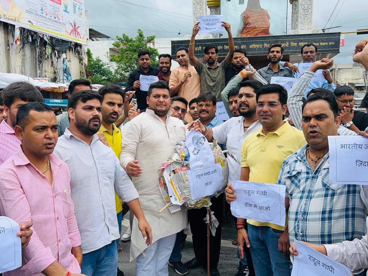 भाजयुमो के कार्यकर्ता राहुल गांधी का पुतला फूंककर विरोध जताते हुए।